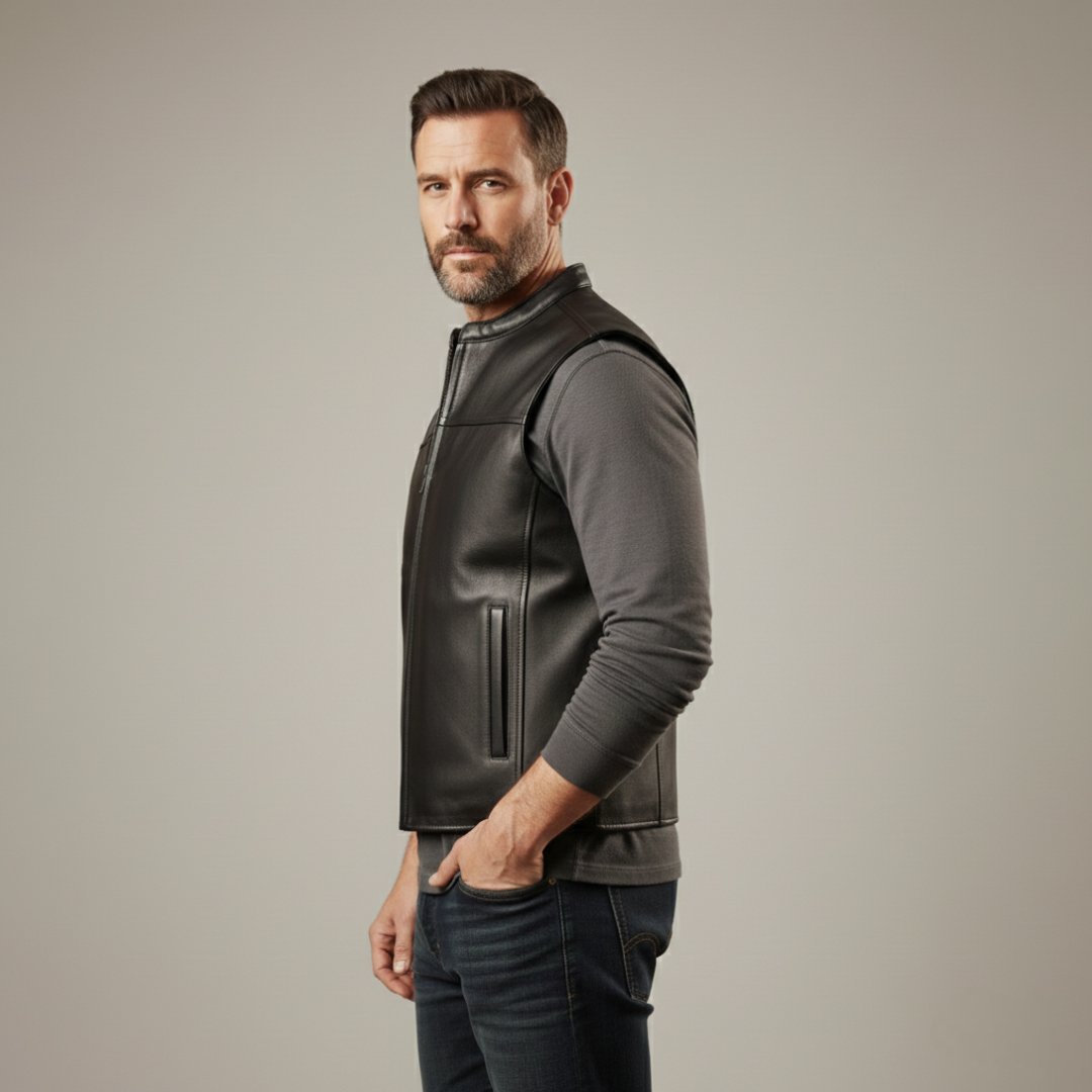 This stylish sleeveless biker vest is crafted from high-quality genuine lamb leather, offering a soft texture, durability, and a premium look. Designed with a modern rugged aesthetic, it’s perfect for casual wear and motorcycle-inspired fashion.