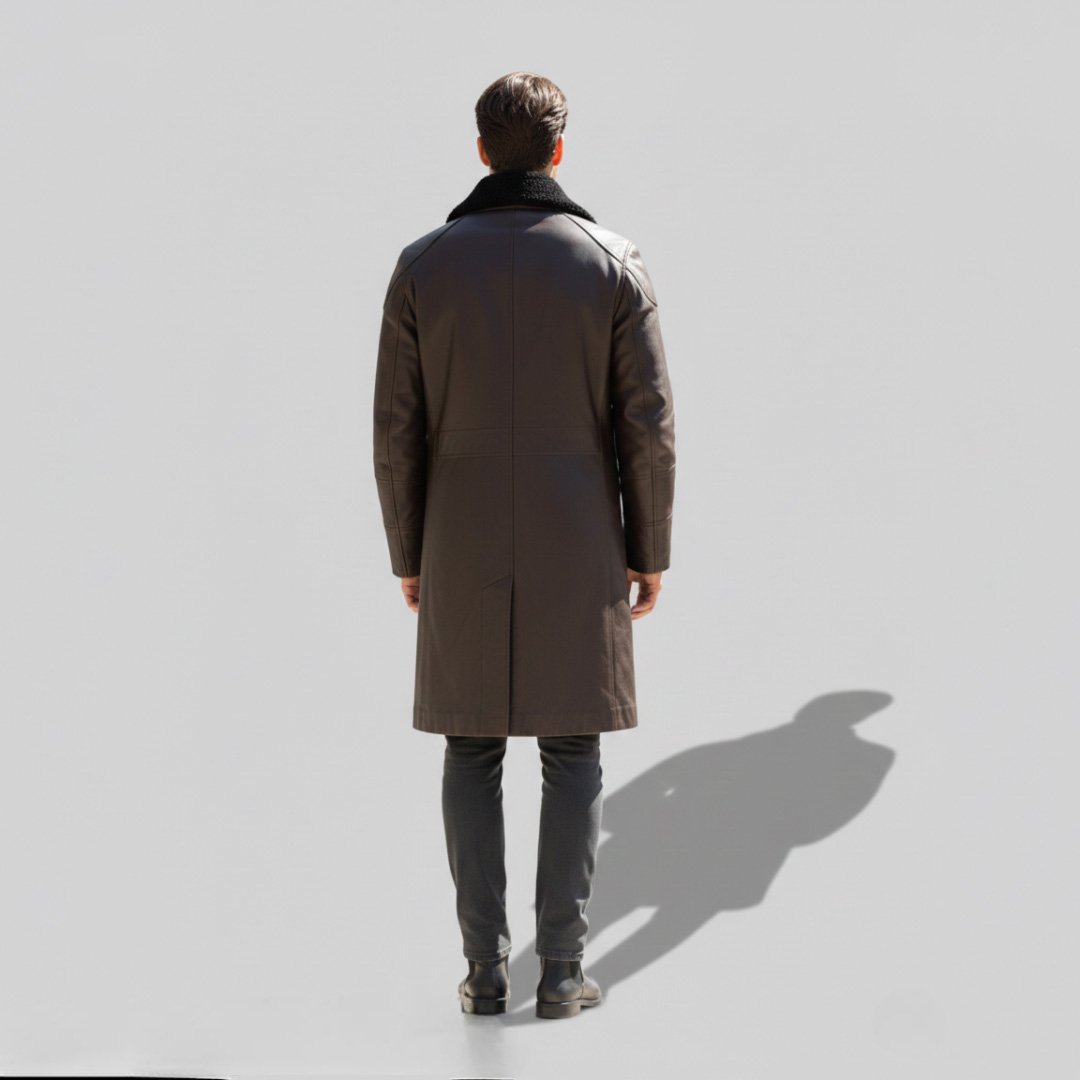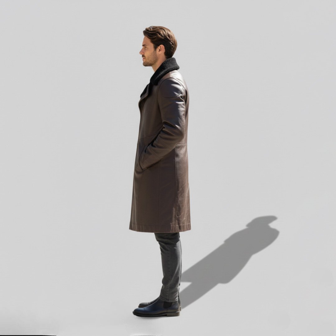 This men’s leather long coat combines a bold, vintage-inspired design with premium craftsmanship. Made from high-quality genuine leather, the coat offers durability, comfort, and a luxurious feel. The long silhouette provides extra coverage and a stylish, commanding look.