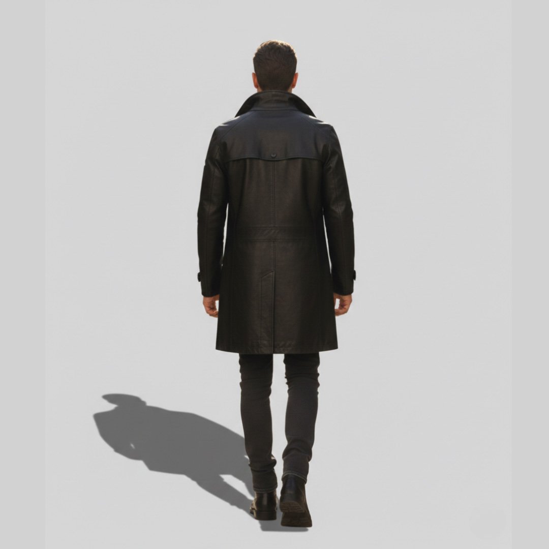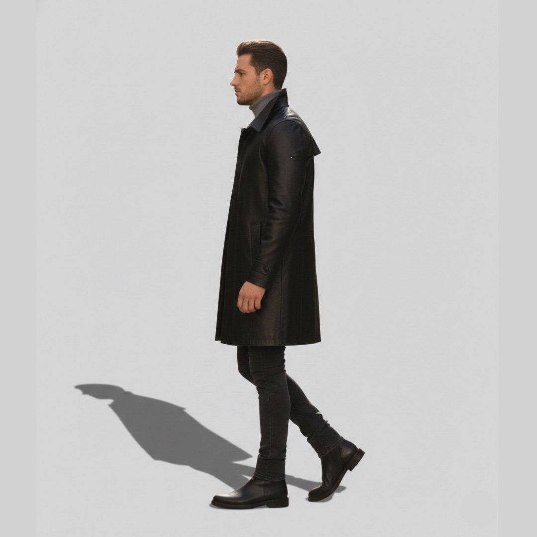 This men’s leather long coat combines a bold, vintage-inspired design with premium craftsmanship. Made from high-quality genuine leather, the coat offers durability, comfort, and a luxurious feel. The long silhouette provides extra coverage and a stylish, commanding look.