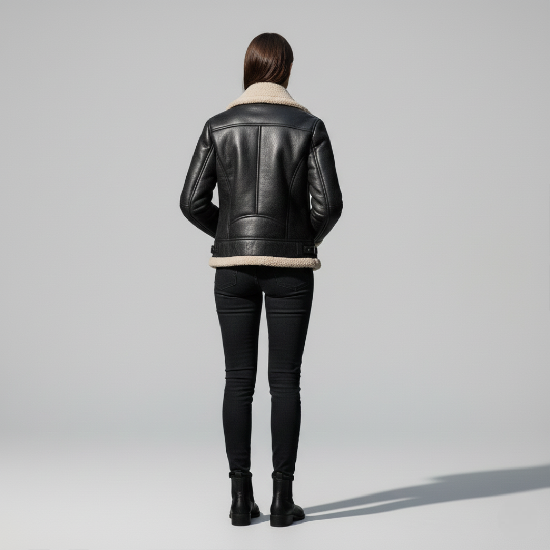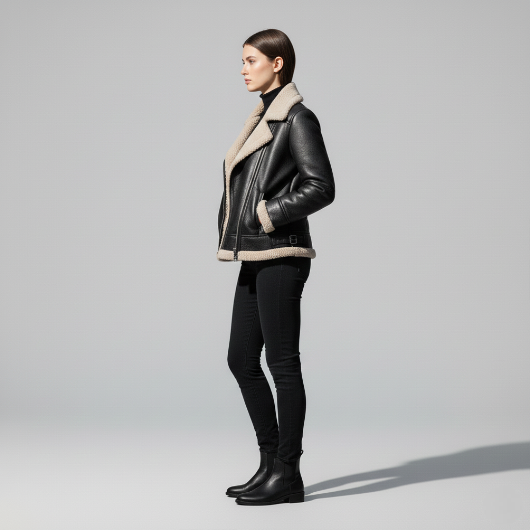 This women’s premium shearling leather jacket crafted from high-quality genuine Lamb leather with a sleek black finish. The jacket features a soft shearling-lined Complete Inner Sherpa Furr, providing warmth, comfort, and refined contrast.