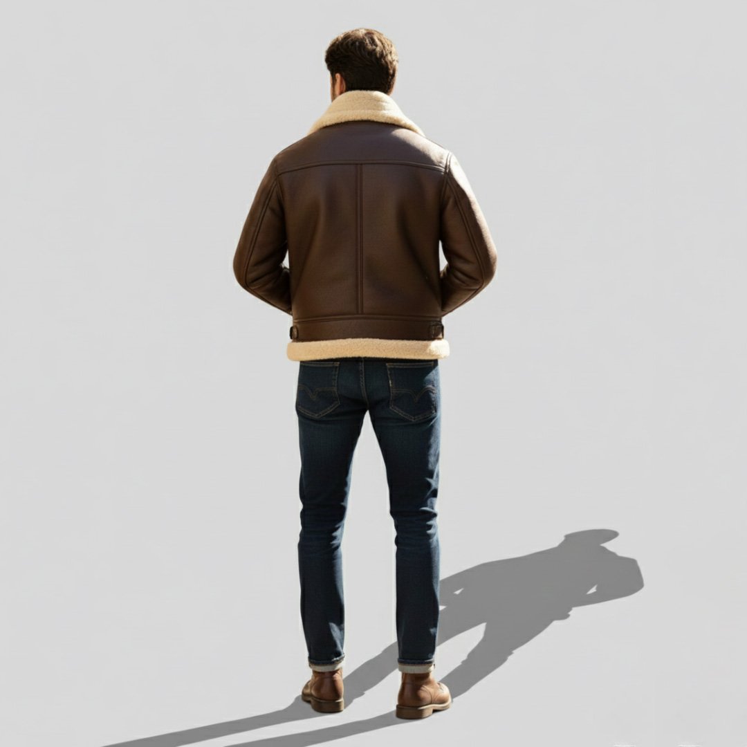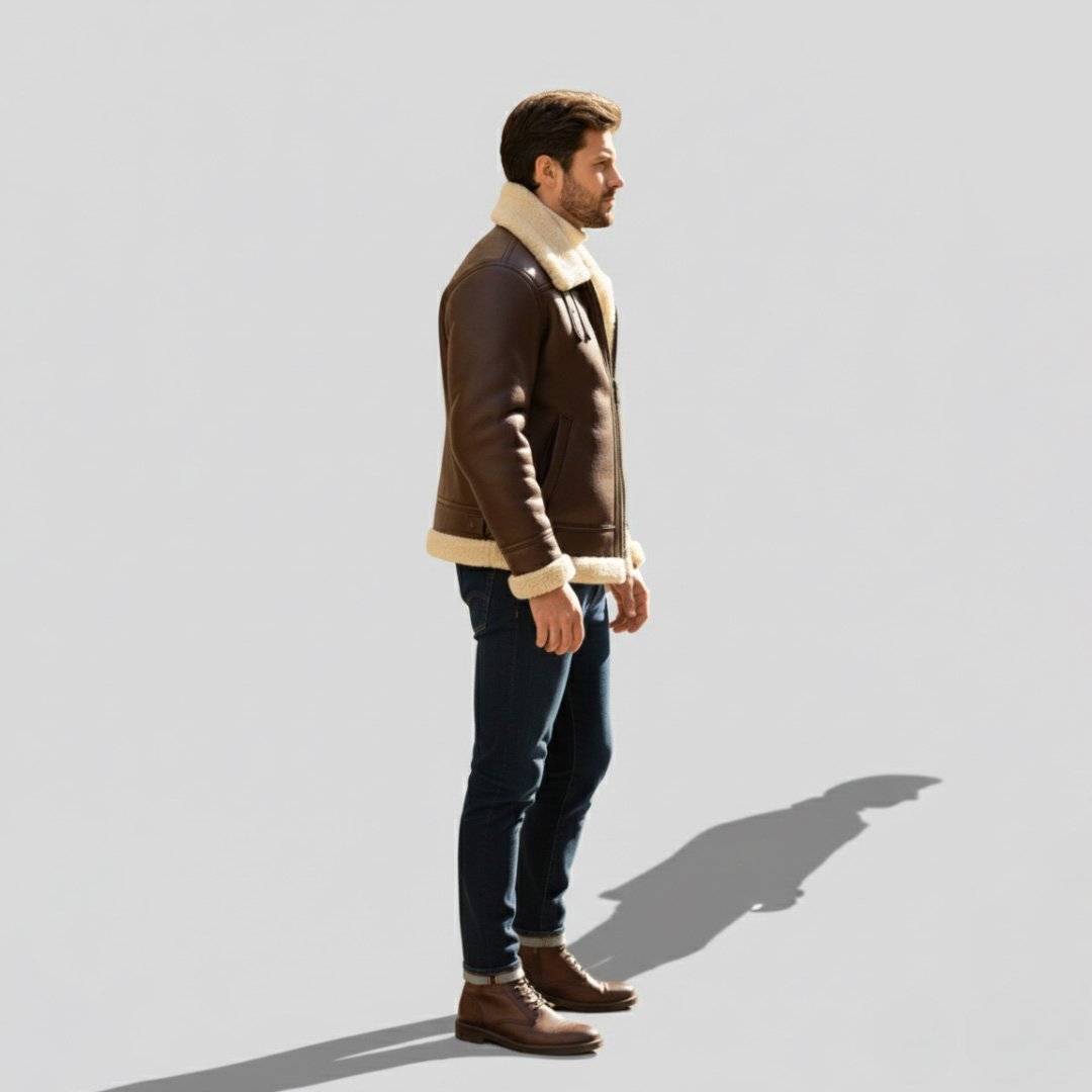 Men’s premium shearling leather jacket designed for modern urban wear with a timeless heritage appeal. Made from High-Quality Genuine Lamb leather, the jacket showcases a rich brown finish, precise stitching, and a structured yet comfortable fit.