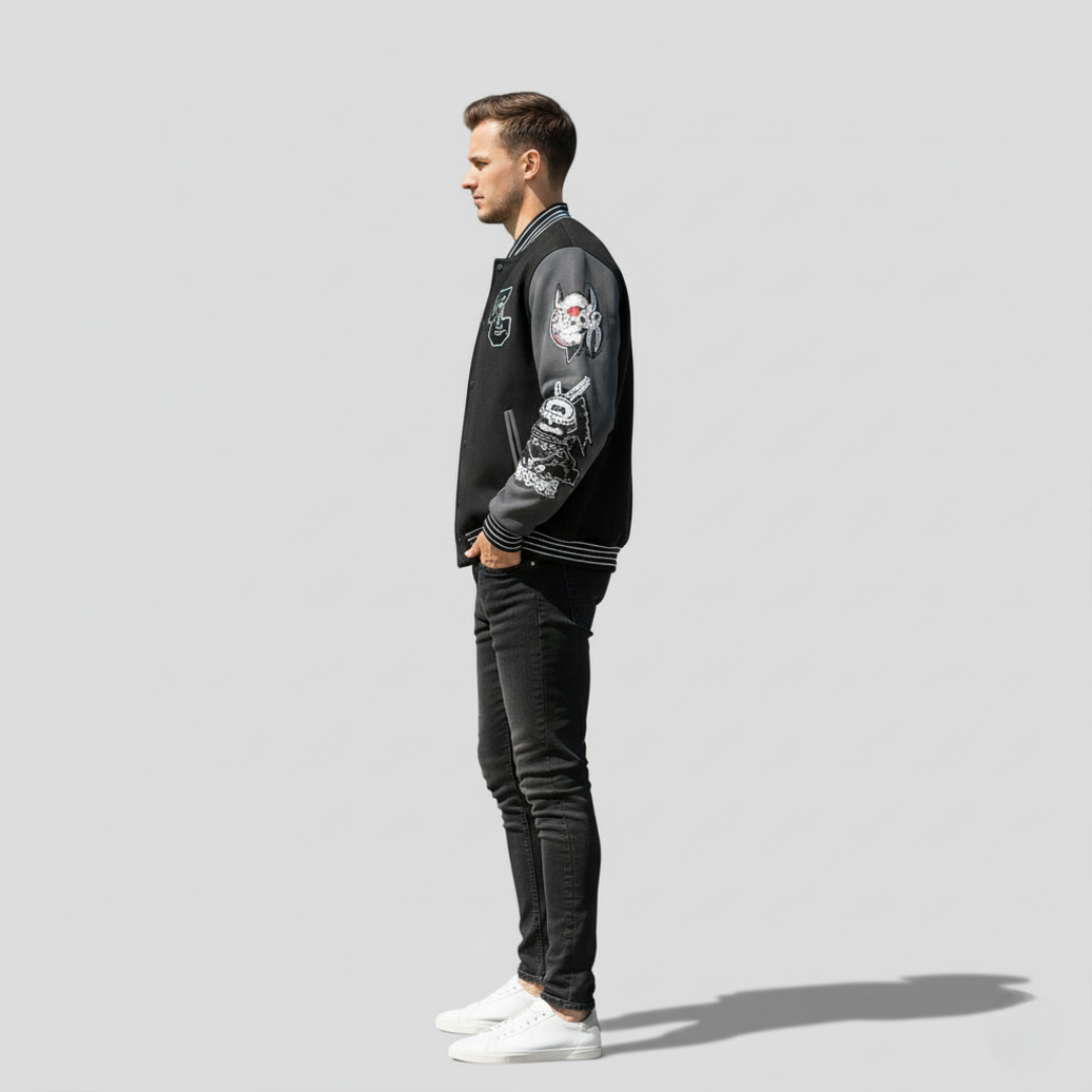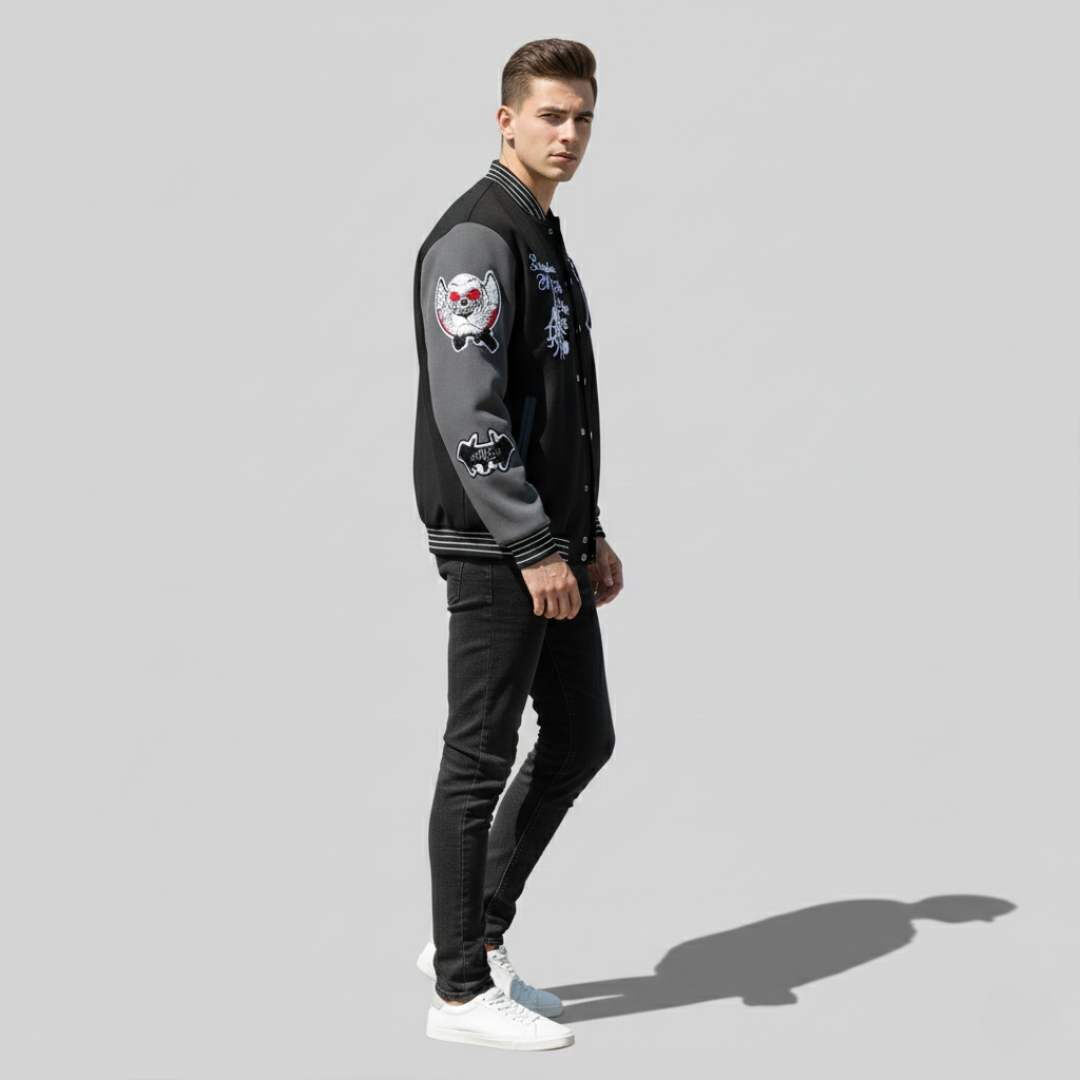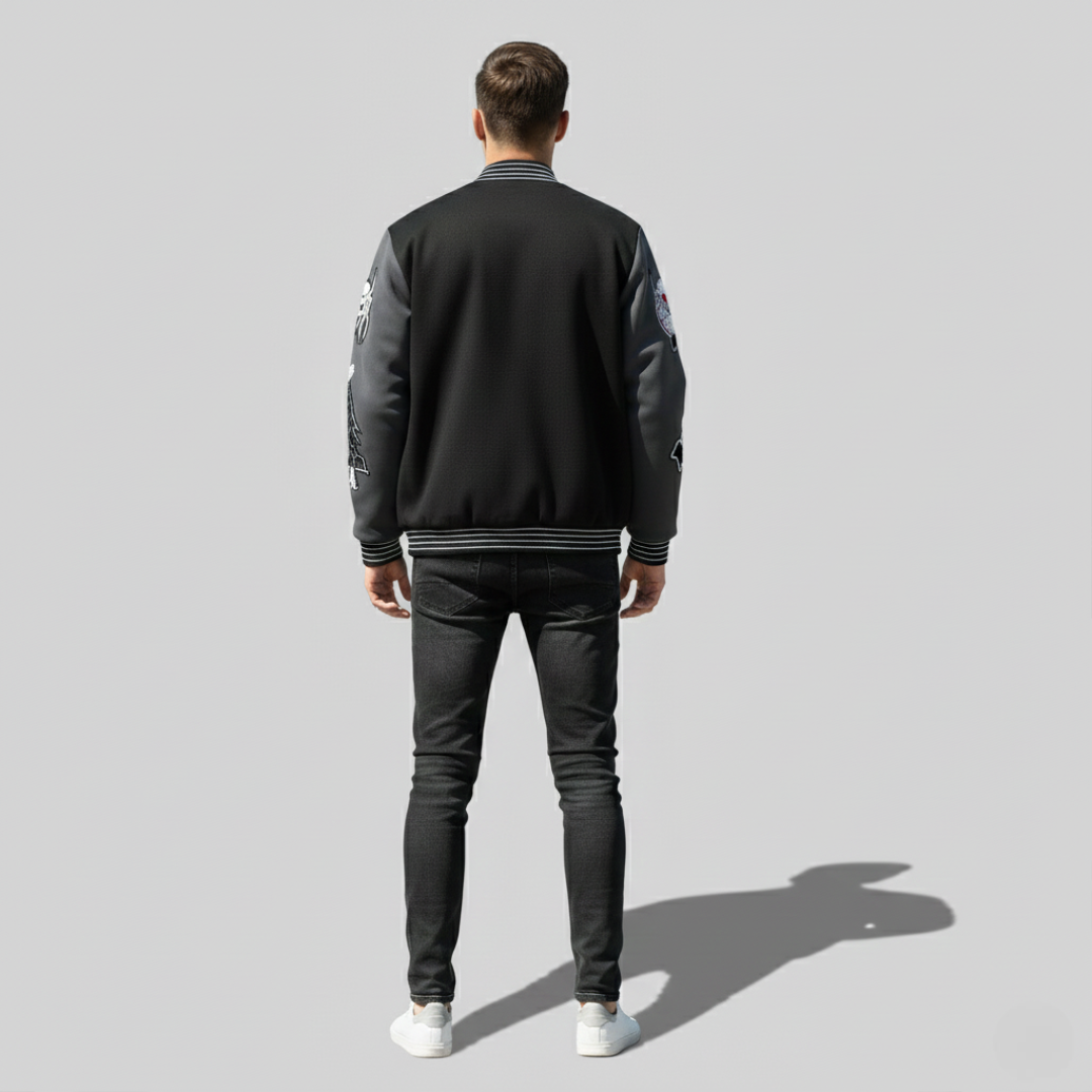 This leather varsity jacket blends classic American varsity design with a modern streetwear edge. Featuring premium black leather sleeves and a durable black fabric body, the jacket delivers a bold yet refined look. The front showcases striking “PIRATES” embroidered lettering, while the sleeves are detailed with unique patches for an authentic varsity aesthetic.