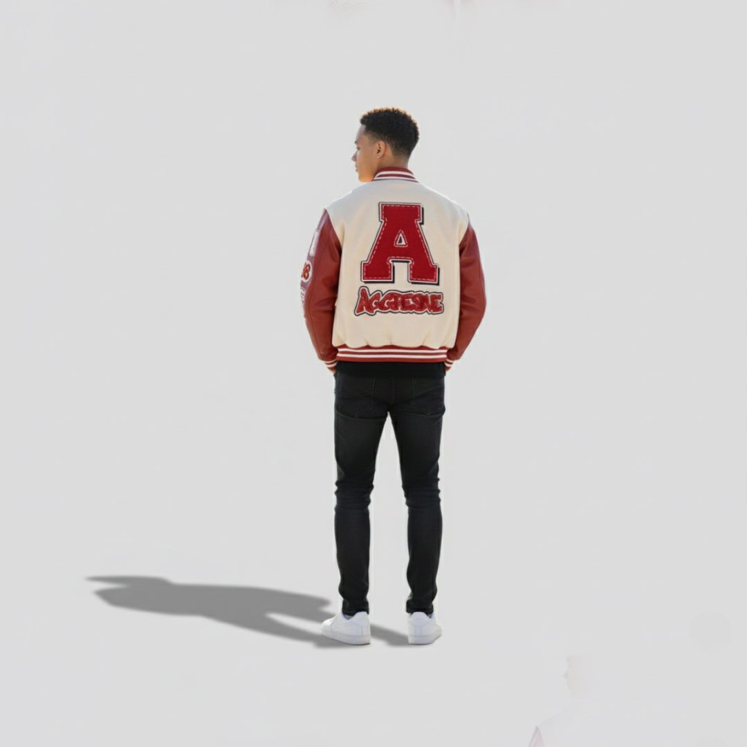 This leather varsity jacket blends classic American varsity design with a modern streetwear edge. Featuring premium black leather sleeves and a durable black fabric body, the jacket delivers a bold yet refined look. The front showcases striking “PIRATES” embroidered lettering, while the sleeves are detailed with unique patches for an authentic varsity aesthetic.