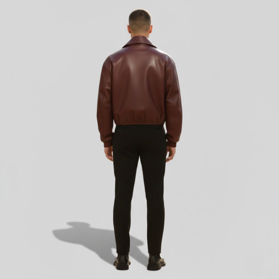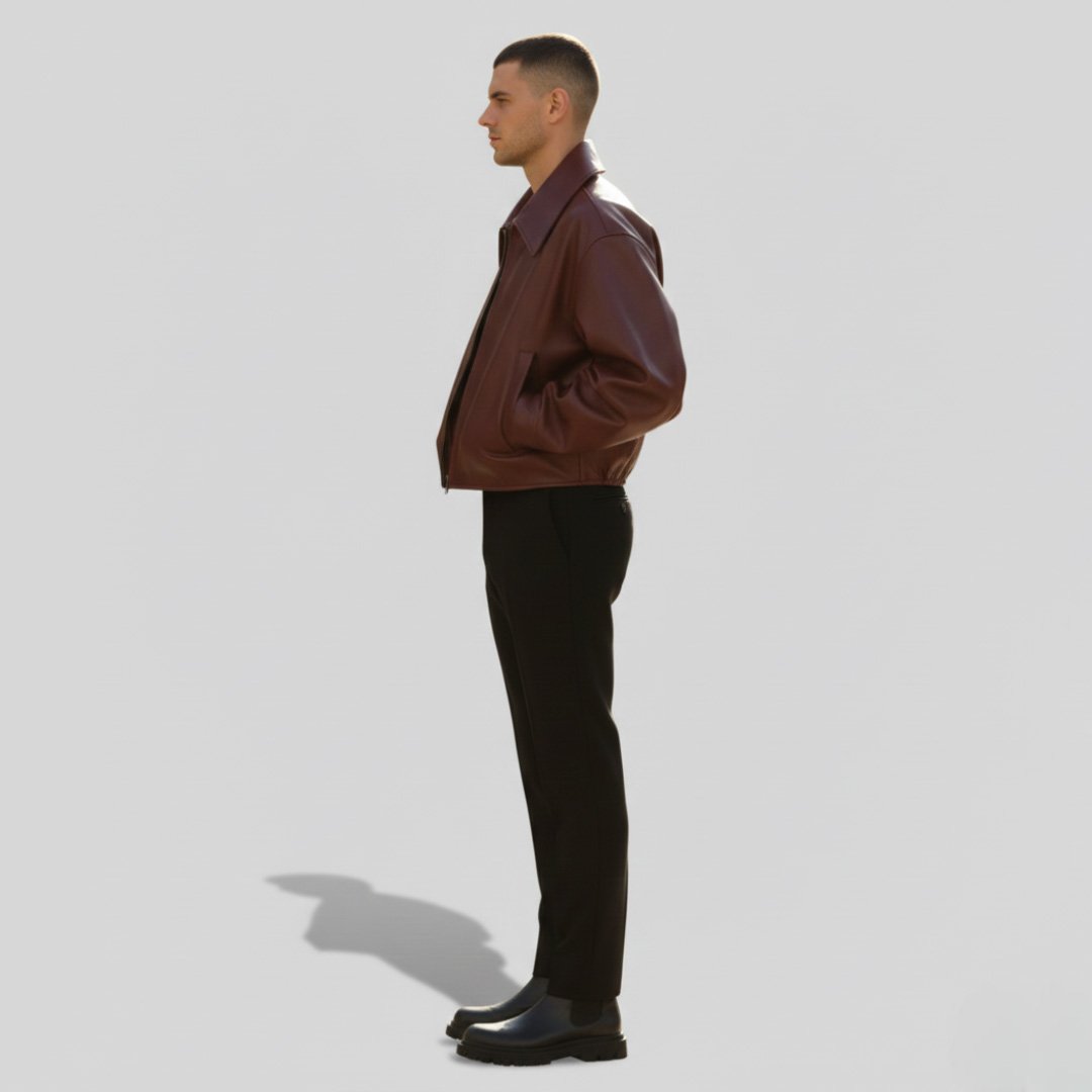Upgrade your style with this sleek and modern men’s leather jacket, designed for a confident and fashionable look. Crafted from high-quality leather, this jacket features a minimalist stand collar design and a smooth front zipper closure, giving it a clean and contemporary appearance.